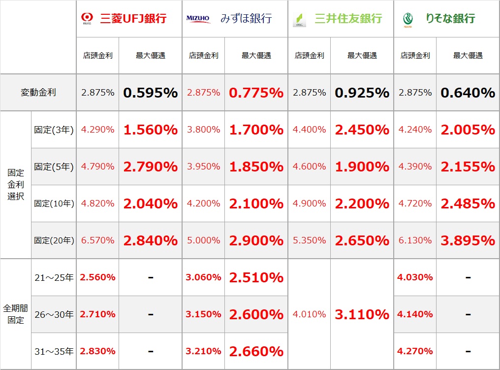 まず変動金利においては基本横ばいですが、これまで唯一利上げを遅らせていたみずほ銀行が他の銀行の店頭金利2.875%に追いつく形で利上げとなりました。