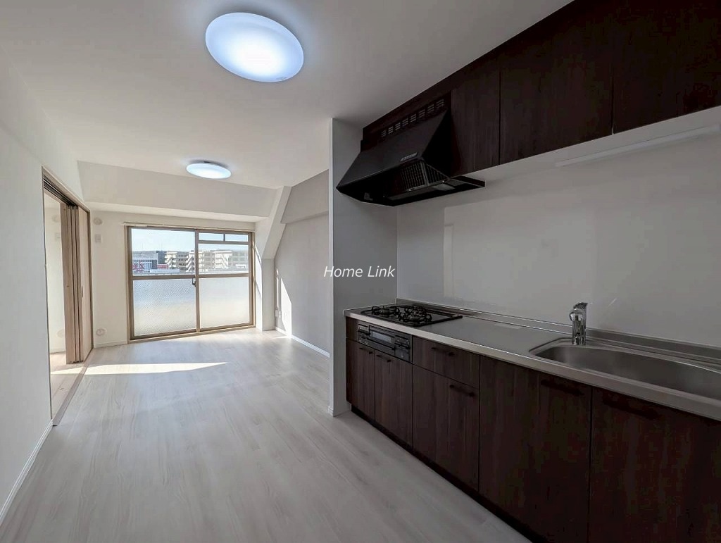 6階、北西・北東向きルーフバルコニー付き角住戸です。室内はリノベーションにより内装も水廻りの設備も一新。7階建ての6階部分ですが上階は無く開放的で眺望良好。