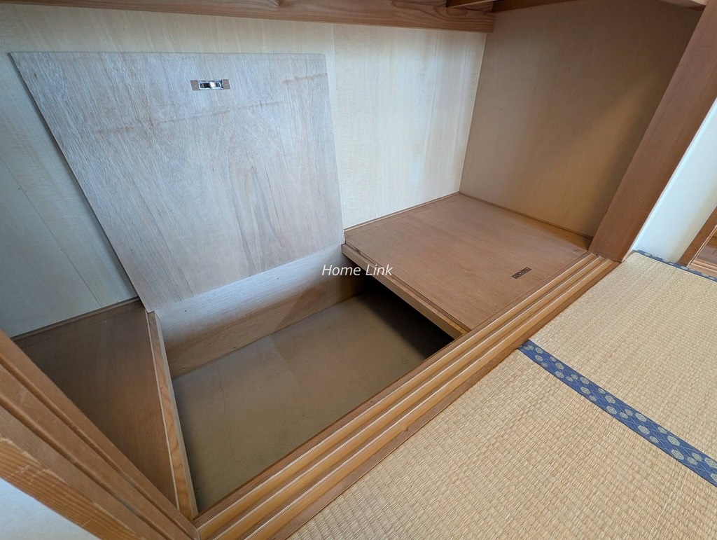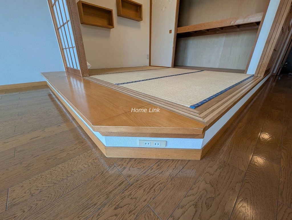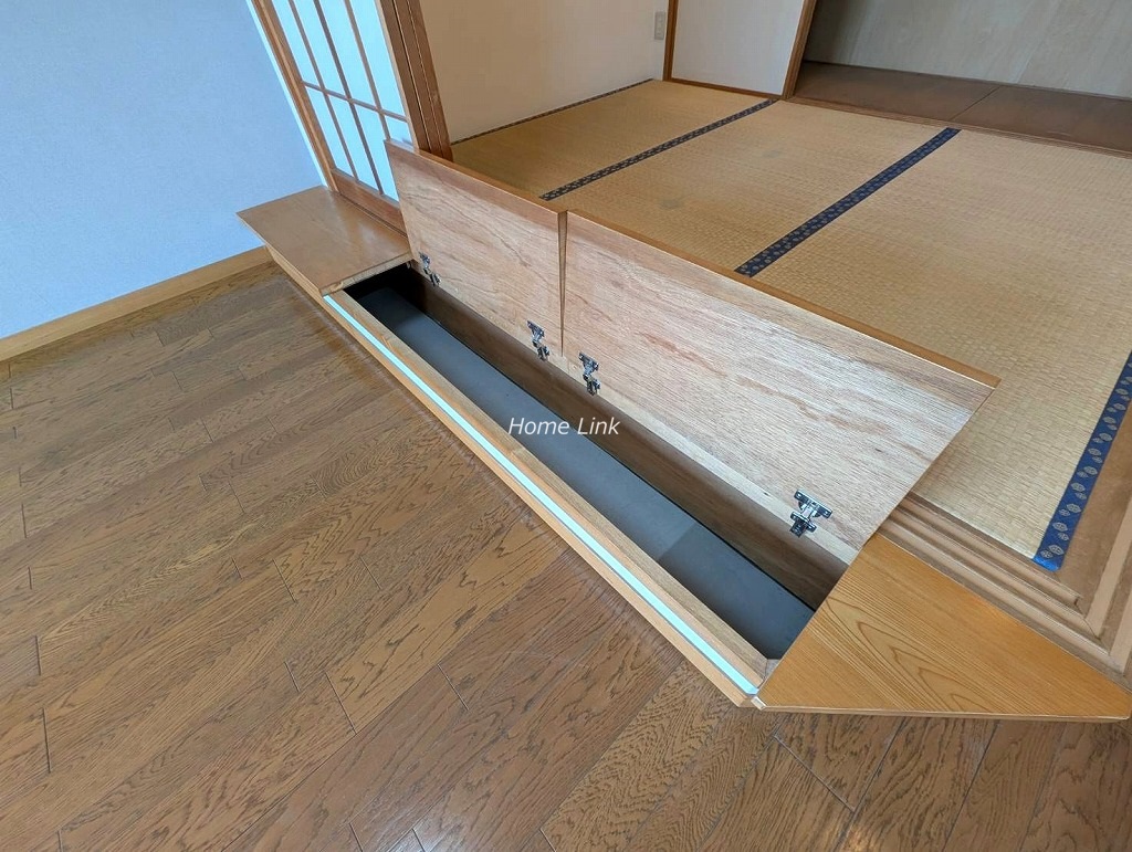 小上がりの和室は障子を閉めると個室となり、開けるとリビングと一体の空間としても使えます。ほどよい段差がちょっとした腰掛としても使い心地がよいです。その段差の空間として畳の下、押入れの床下など収納スペースとして活用できるように加工されています。