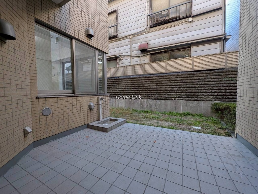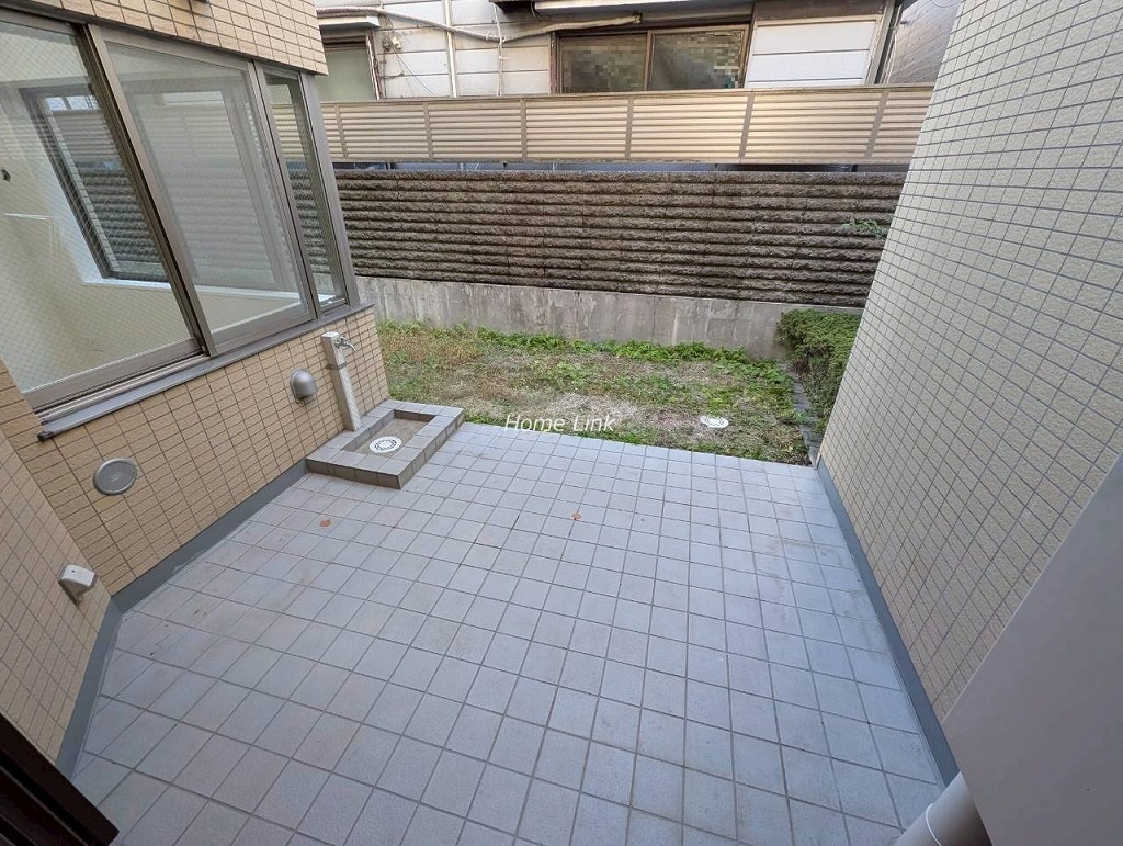お部屋は1階、専用のテラスには水栓を備えています。タイル張りなので維持管理がラクで水はけも良いので、ガーデニングスペースに適しています。洗濯物を干すときもラクラクです。