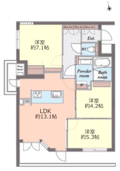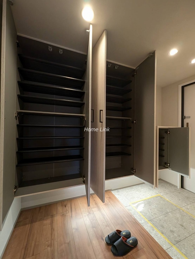 玄関にはとても大きなシューズボックスがあり充実の収納量です。またクランクイン玄関のため玄関から室内が見えずプライバシーが守られる間取りです。