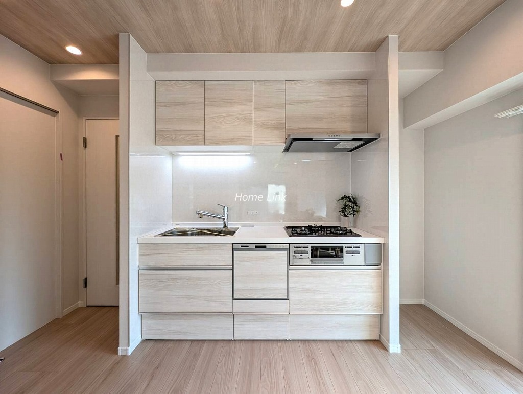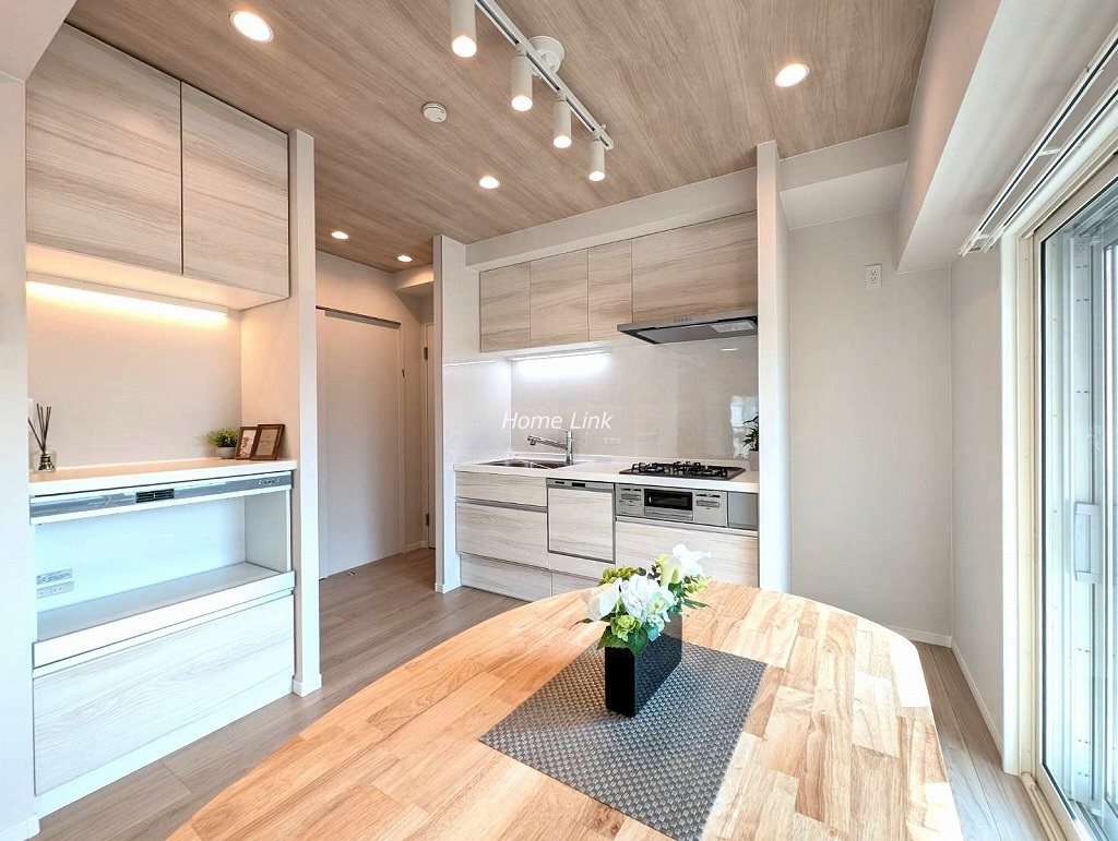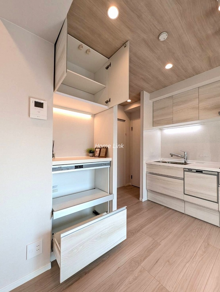 リビングの天井には木目のアクセントクロスを採用し、全体的に上質でやわらかい雰囲気に仕上がっています。キッチンには家電収納も造り付けで備わっています。