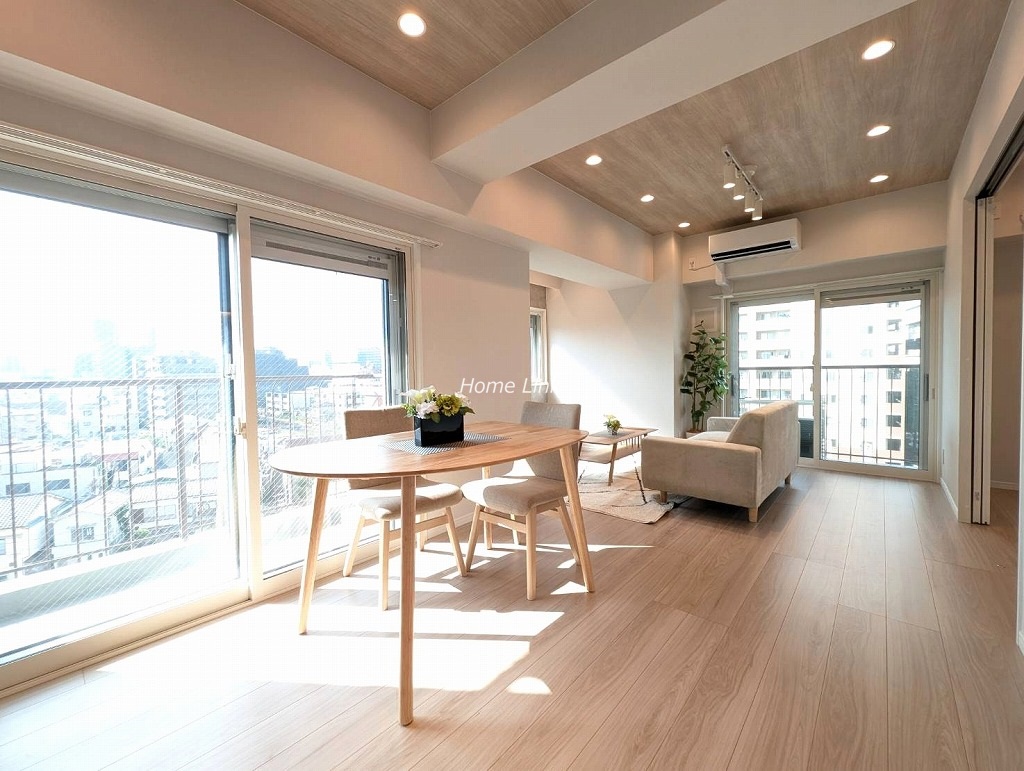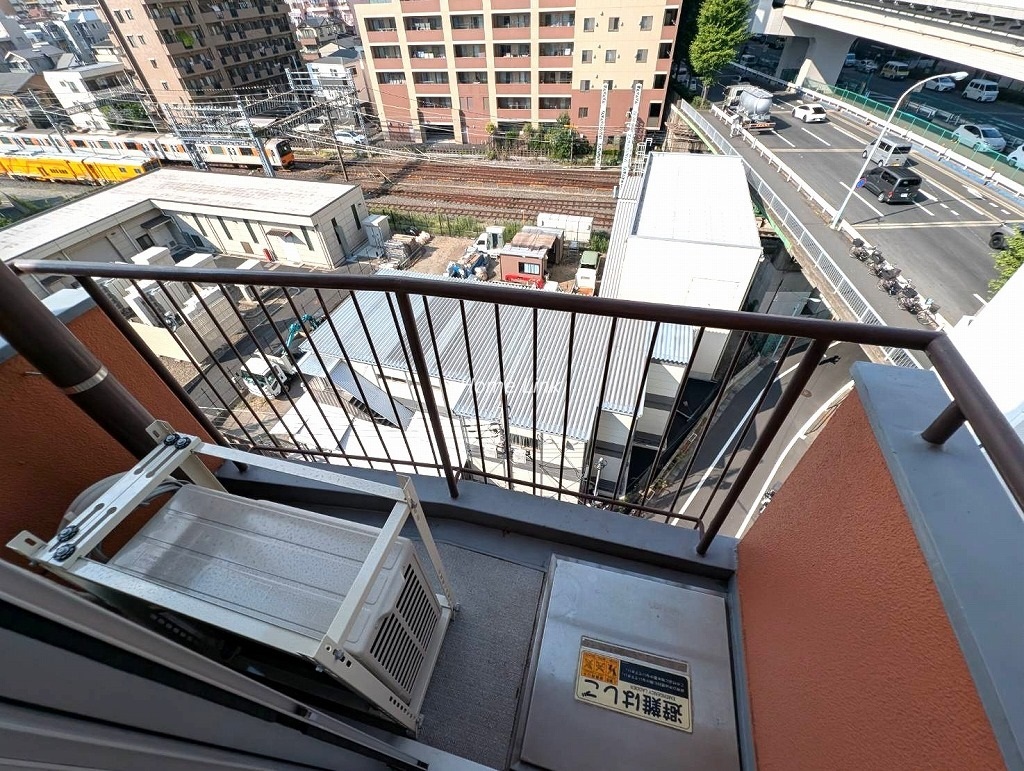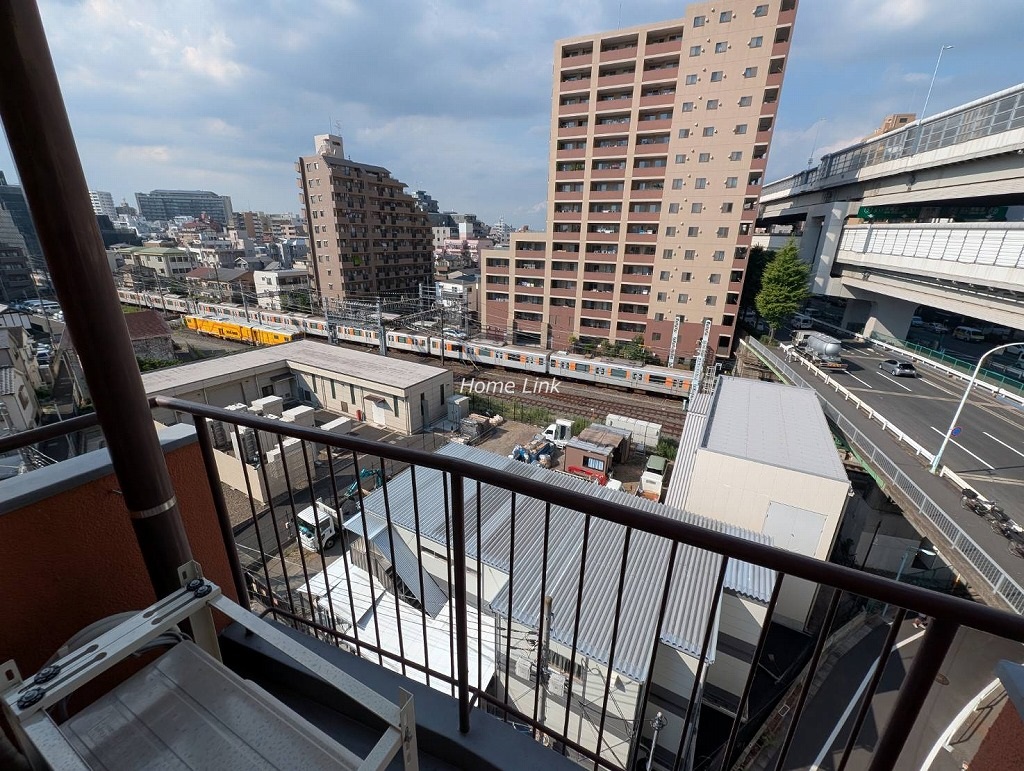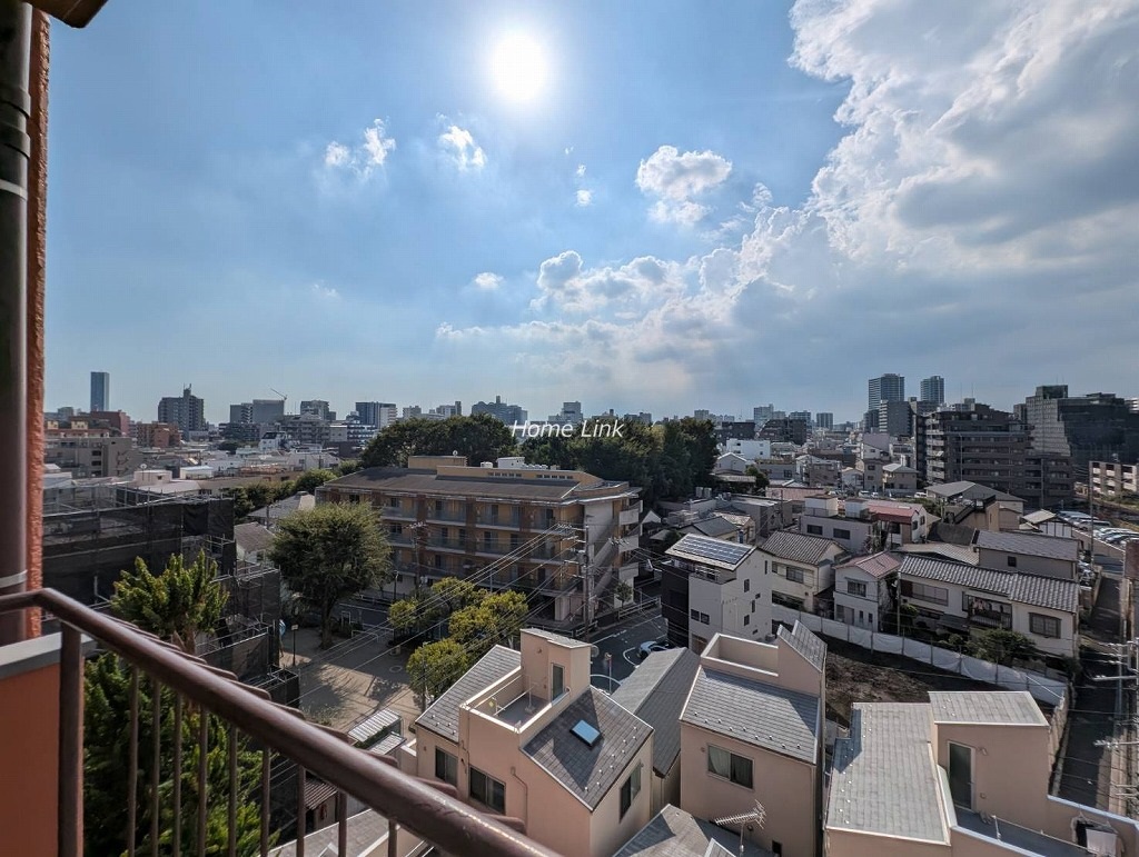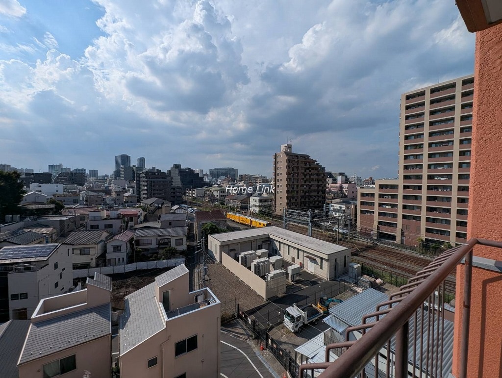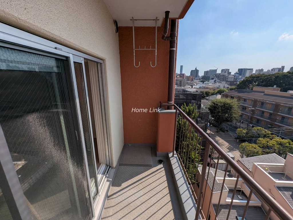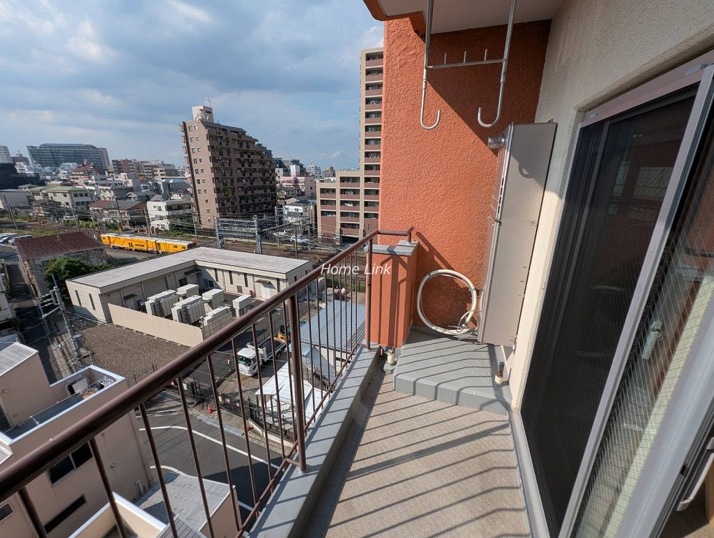 7階部分、西・東・北の三方角部屋です。バルコニーは西と北の二面にあります。メインバルコニーは西側となり、北側バルコニーからは東武東上線の電車が見えますが全窓にインナーサッシがついた二重窓で気密性・断熱性・防音性が高まり、西日の暑さや電車の音も軽減されます。