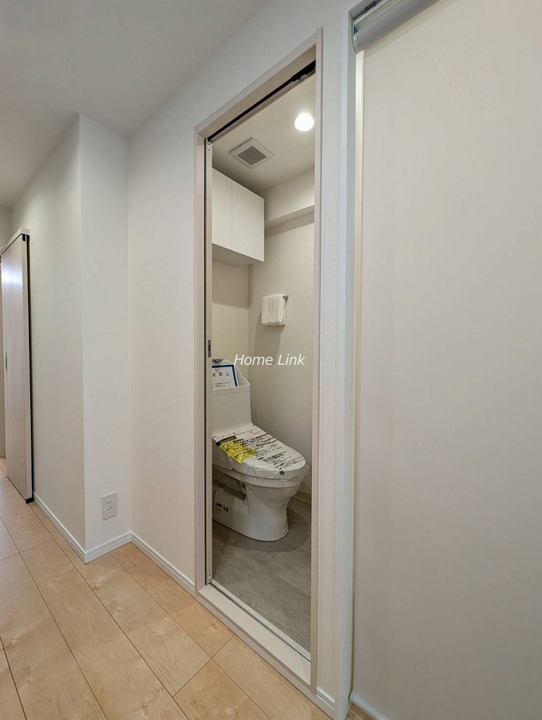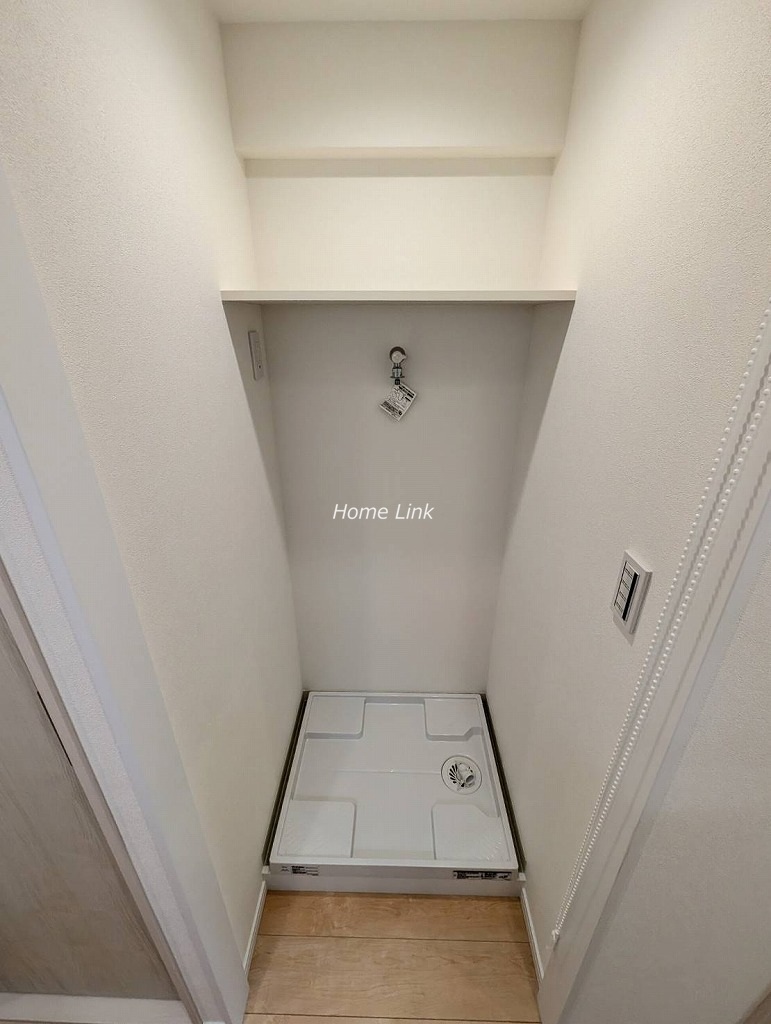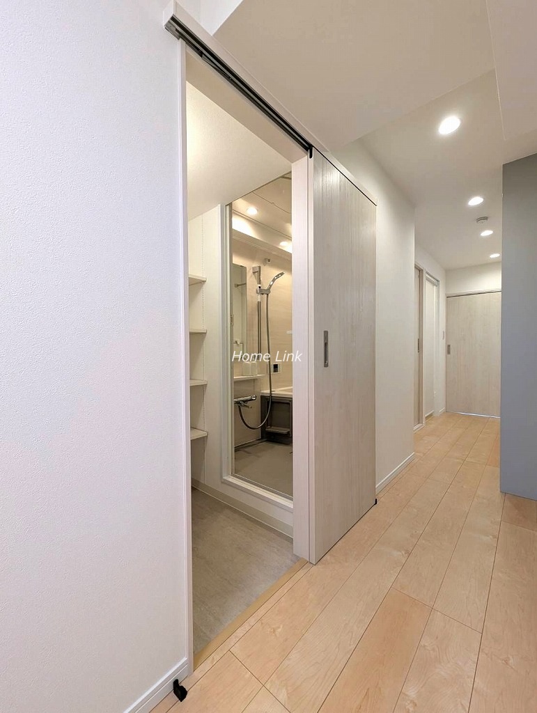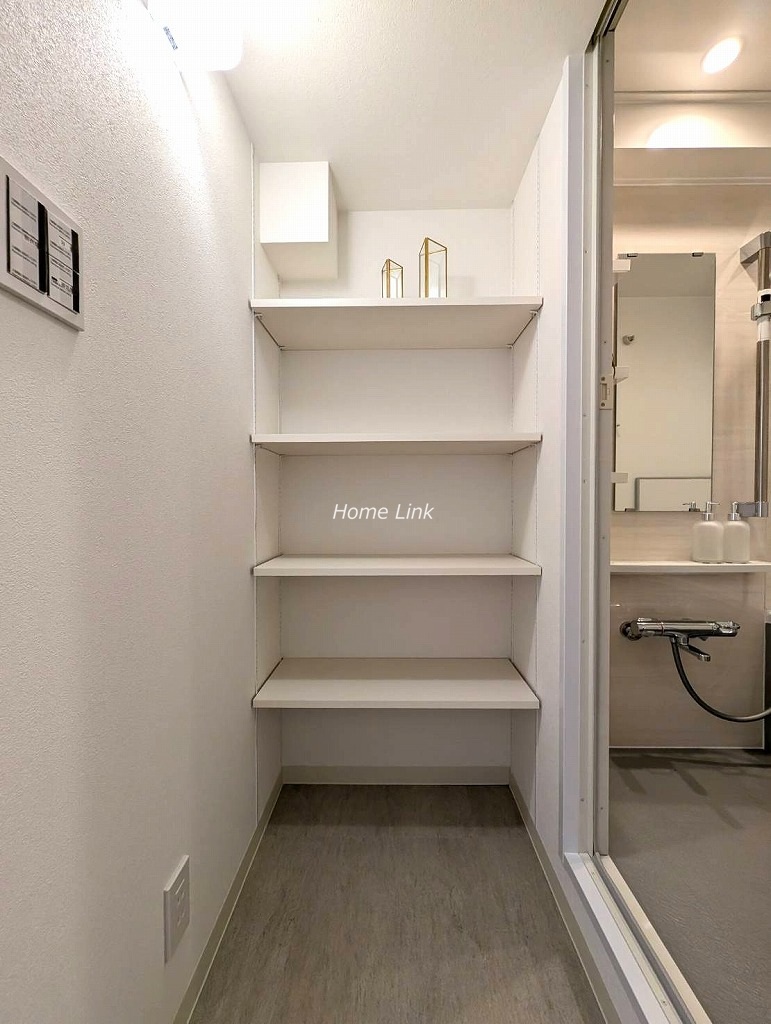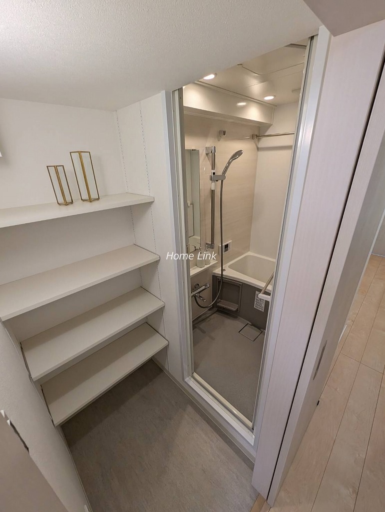 玄関に洗面台があるので帰宅時にまず手洗いができます。お風呂の脱衣場とは分離してキッチン裏に洗濯機置場があります。脱衣場には可動棚の収納が造作されています。またトイレと脱衣場は引戸、洗濯機置場はロールスクリーンで開けっ放しでも邪魔にならず、機能的で使いやすい水回り各所となっています。